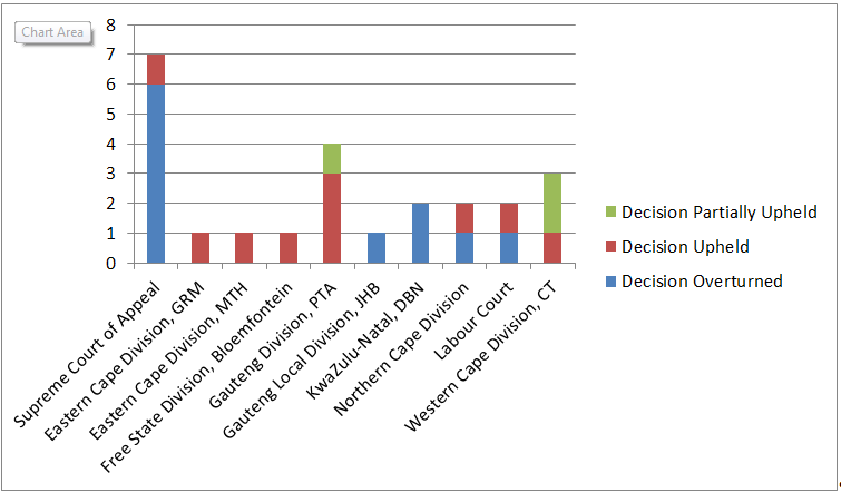 This graph shows the results of appeals to the Constitutional Court in relation to the Court from which the appeal was held. For example, if a case was first heard in the Eastern Cape High Court, and then went on appeal to the Supreme Court of Appeal, the Eastern Cape High Court’s decision is not reflected on this graph, only the Supreme Court of Appeal’s decision is reflected.