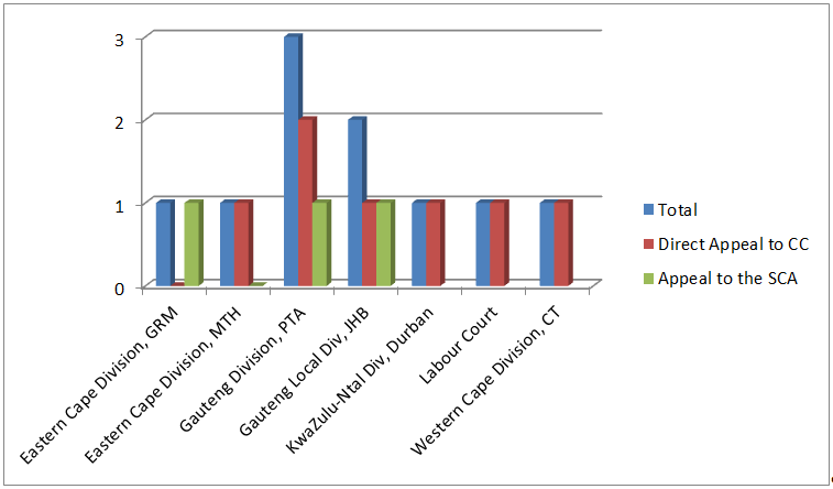 This graph shows how a case got to the Constitutional Court, i.e. did it go straight from the High Court to the Constitutional Court, or was there first an appeal to the Supreme Court of Appeal.